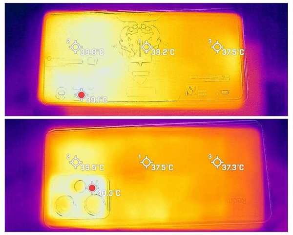 30 分钟游戏之后,使用红外测温仪,测得此时手机正面最高温度为 39.1 ℃,机身背面为 40.3 ℃,在后摄模组区域,上手会有一定的温热感。