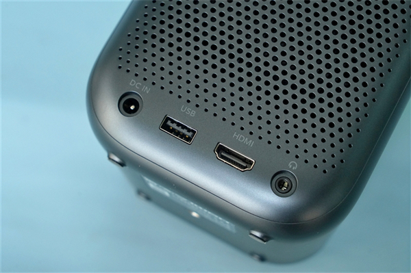 背面采用了整体网格开孔的造型,底部则是4个接口:DC电源、USB、HDMI、3.5mm耳机插孔。