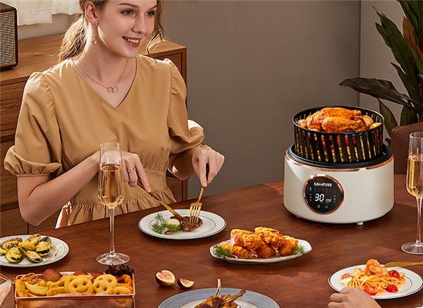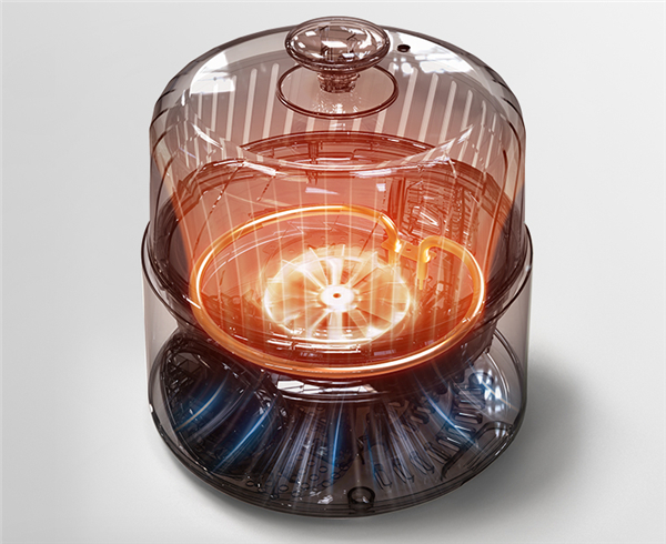美食的味道取决于时间和火候的把控,早期的空气炸锅很多采用上置发热体,容易出现顶部温度过高底部温度偏低的问题,影响食物口感。在这方面宜盾普空气炸锅的表现让我相当满意,这得益于它的下置发热体设计,大面积发热盘表面有凹凸有致的罗圈纹,配合炸篮以及玻璃盖纹理形成3D环绕式加热,可有效提升加热效率,让食材可以360°均匀加热。