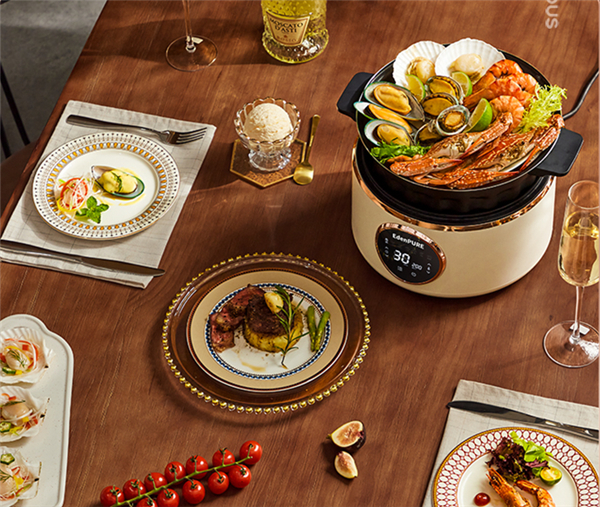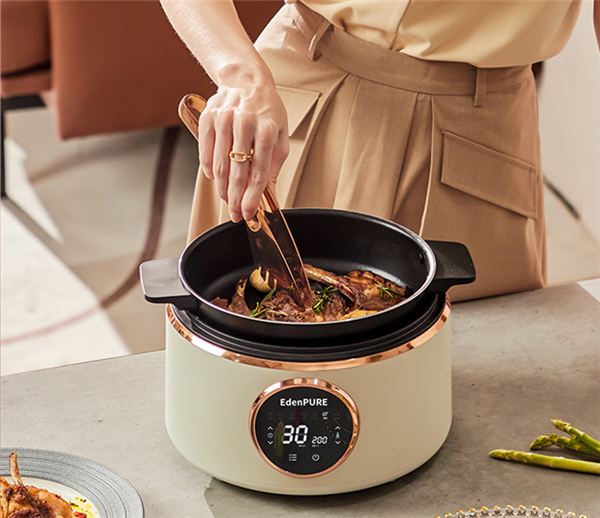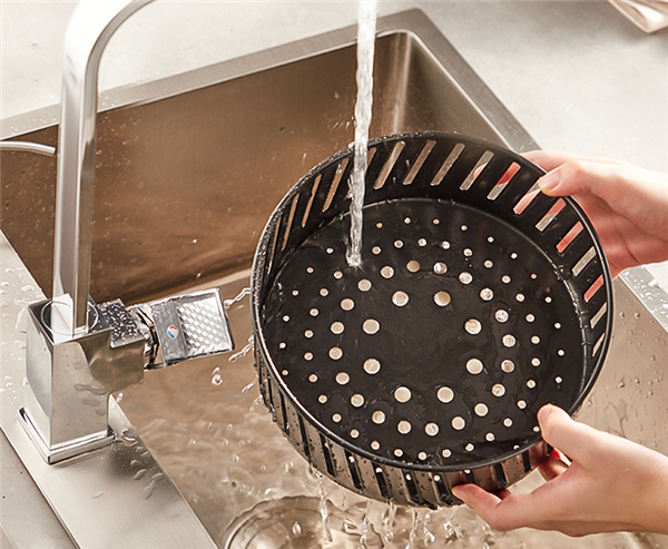 宜盾普空气炸锅并没有像大多数多功能蒸煮锅一样采用一体式设计,而是采用分体式设计、平板加热板,像炸蓝、接油盘、蒸盘、深锅和煎烤盘都是独立可清洗的,并且采用了易清洁的不沾材质,无焊接一体成型,不存在藏油污垢的间隙,用完清洗即可焕然一新。