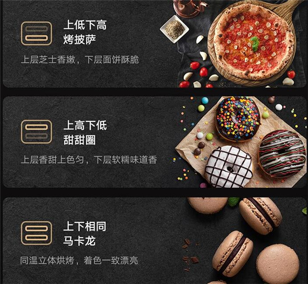 其次是上下独立温控技术,对于高阶烘烤达人来说,最难的问题就是食材的火候难以控制,往往是失之毫厘,差之千里。米家智能嵌入式蒸烤一体机P1系列,支持上下烤管独立控温,匹配上下立体感温探头,最高可支持上下20℃温差设定,定制专业烘烤方案,满足进阶烘焙的烹饪需求。烤披萨,烤管温度上低下高,上层芝士香嫩,下层面饼酥脆。还有甜甜圈、马卡龙,这些对温控要求高的烘焙食品都能轻松应对。