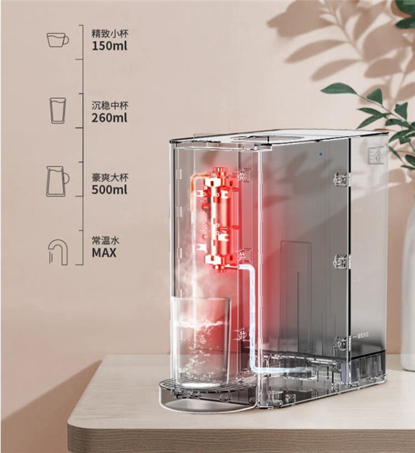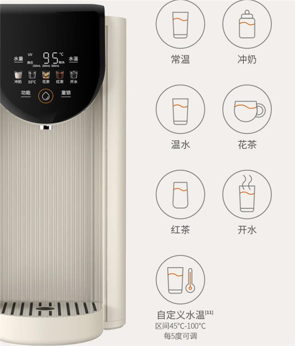细心的小伙伴可能看到了屏幕上的功能触控按键,例如像有孩子需要饮用45℃常温水时、例如你想饮用55摄氏度温水时、例如你家里的老人想要饮用75℃的花茶,90℃的红茶,例如你的媳妇想要用100℃开水泡面时它都能满足,更精准的是它的温度还可以做到45℃-100℃无极调温,每一度的温度都可按照需求调节,充分满足个性化的使用需要。