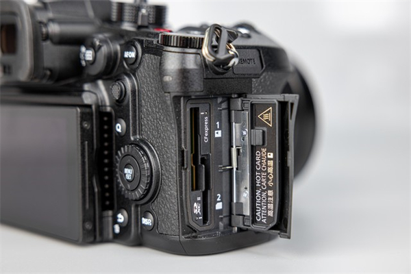 松下GH6相机设计了双卡槽,一个是CFexpress Type B卡槽,一个是SD UHS-II U3 V90卡槽。大家如果录制高码流的视频,比如800Mbps和600Mbps,可以选择CFexpress卡;如果录制低码流,比如200Mbps,可以选择高速SD卡。