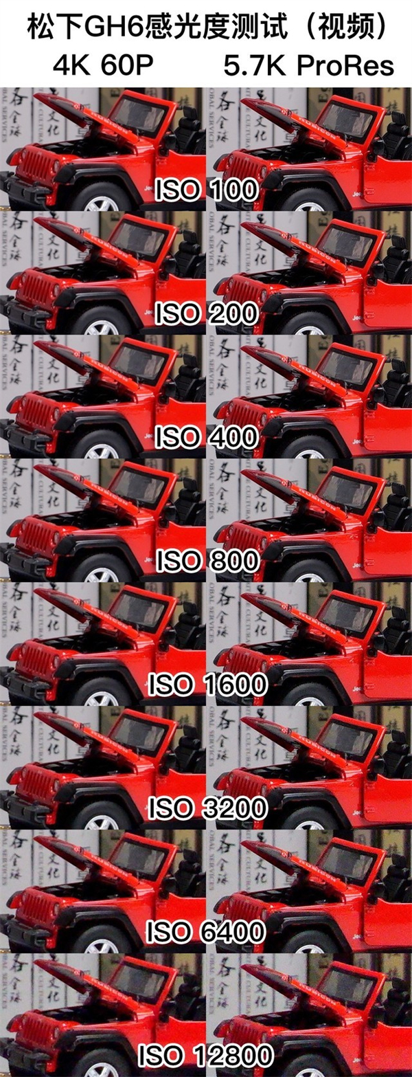 视频方面,可以看到在4K 60P和5.7K ProRes视频规格的拍摄中,松下GH6的高感控噪表现与照片拍摄的情况高度相似。在低感光度范围内,一直到ISO 3200,松下GH6带来了非常纯净的画面表现。从ISO 6400开始噪点增加,但仍有可用的细节保留。总体来看,5.7K ProRes视频的细节解析力和高感下的细节表现更优秀,更适合拍摄高质量视频素材使用。