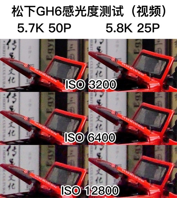 松下GH6还支持17:9比例4:2:0 10bit的5.7K 50P/60P视频以及4:3比例4:2:0 10bit的5.8K 25P视频,这两个视频格式下,松下GH6的高感表现与前面类似。在ISO 3200时,细节保留比较多;ISO 6400时,视频的细节保留开始下降,噪点增加明显,画面的可用性开始打折扣。