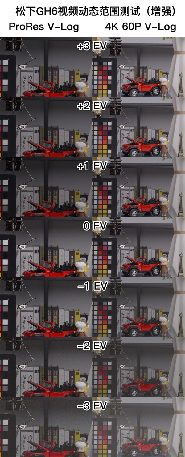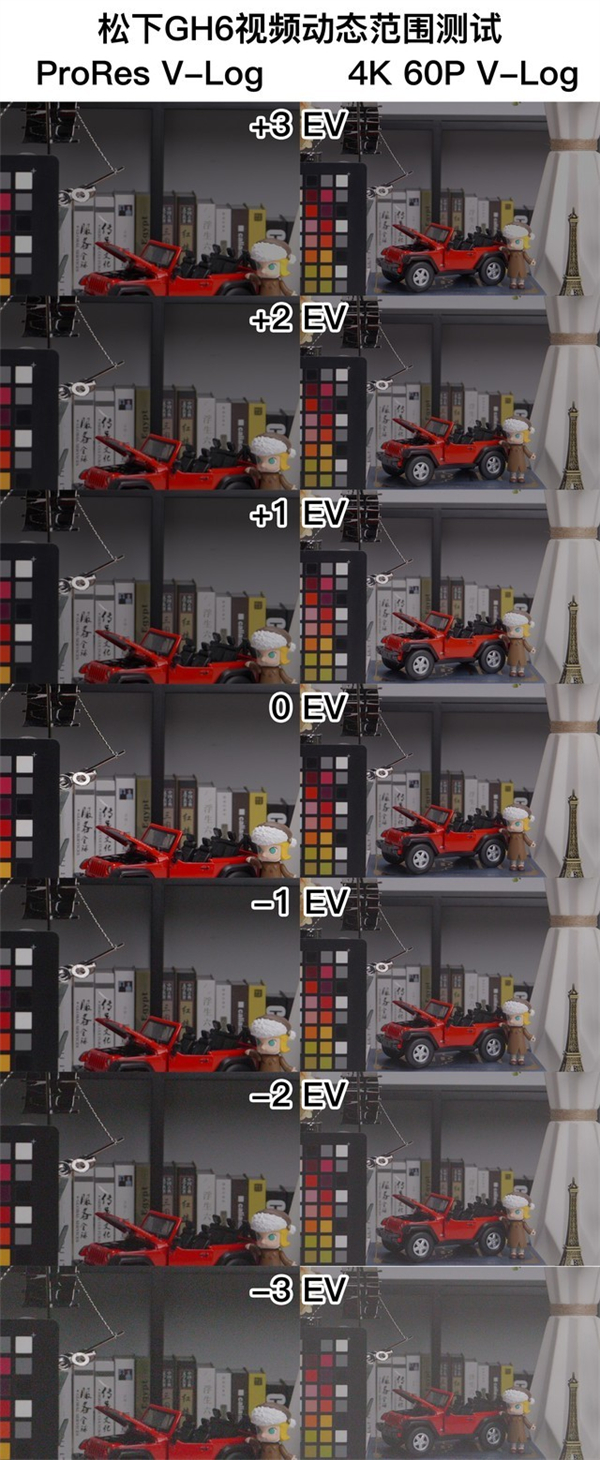 ProRes 422 HQ格式下,可用范围+2 EV曝光到-2 EV曝光,但是考虑视频画质的影响,我们建议使用+1.5 EV到-1 EV之间。+2 EV开始,高光区域的细节出现丢失,有可能难以找回;欠曝时,-2 EV细节保持良好,但是暗部噪点过多,-1EV 时暗部细节可用。