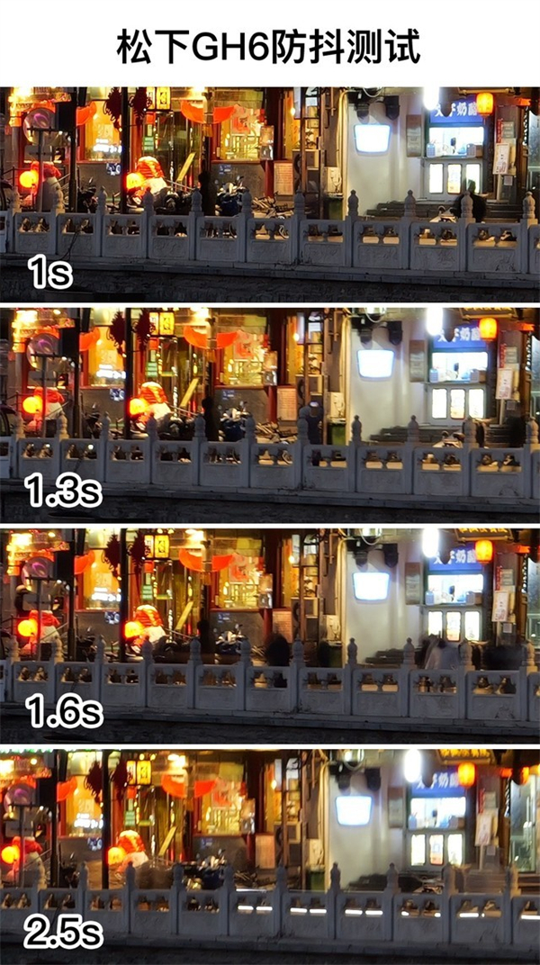 通过测试,我们可以看到松下GH6在25mm焦段(等效转换为约50mm)手持1秒、1.3秒、1.6秒的测试中都可以保持非常好的稳定性,画面的稳定性表现非常优秀。直到2.5秒的曝光时长下,画面才出现了轻微的抖动,但是因为我们的截图区域很小,在整体的照片中不进行100%放大查看,是看不出来这种轻微抖动的,因此进行网络传播的时候,手持曝光2.5秒的照片依然可用。