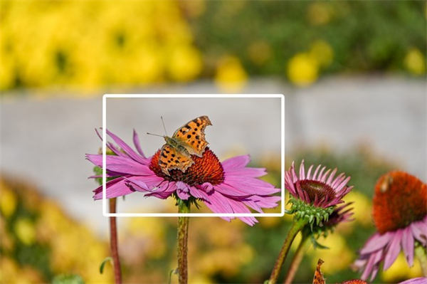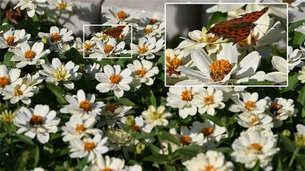 2450万像素完全够用,将照片方框区域放大,蝴蝶和花朵的细节表现非常好。