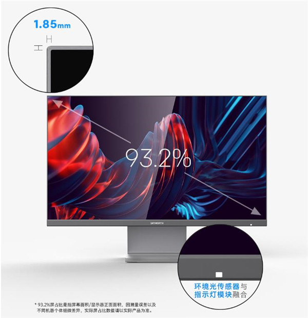 创维F27B40Q采用了纤薄的机身设计,机身上半部分的边框厚度约9mm左右,接近一部普通手机的厚度。机身上半部分的厚度约9mm左右,与普通手机厚度相当。
