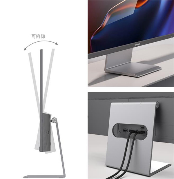 创维F27B40Q的底座呈L形,看上去很像是一体式电脑的底座。这种底座虽然简洁,但是不支持人体工学,且不可拆卸,仅支持-5°~±15°的俯仰角调节。另外,创维F27B40Q在底座支架上靠近接口的部分预留有很大的开孔,方便用户接线。配备65W输出的全功能Type-C接口。