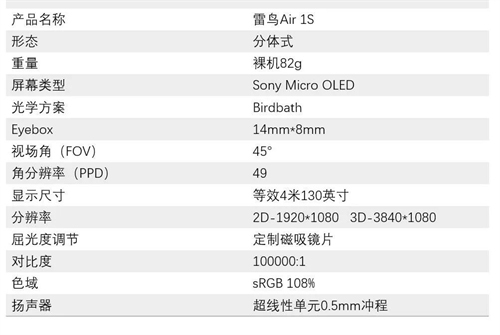 显示方面,雷鸟Air 1S采用了Micro OLED+Birdbath方案,搭载两块索尼硅基OLED屏幕,分辨率为单眼1920*1080,色域sRGB 108%,对比度达到了100000:1,画面色彩偏暖。