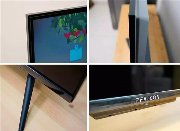 边框采用了金属拉丝工艺,颜值高质感佳,同时整体的稳定性也更有保障。边框无论是宽度还是厚度都控制不错,独立控光分区的加入也并未让机身显得臃肿。底部支架也采用了金属材质,可以提供更好的稳定性表现,哑光工艺处理更加沉稳低调也更加耐看。屏幕正下方可以看到FFALCON字样的品牌Logo,整体的设计风格很好的契合了简约大气的特点。
