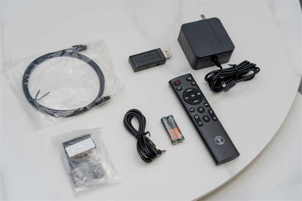 再来看看产品的配件,相当的丰富,有光纤线,墙壁安装支架,AUX音频线,无线模块等等。你看,连电池都送上了。我最讨厌的就是那些配遥控器却不配电池的,万一家里没有这个电池,想象一下那画面,抱着激动的心情开箱后发现遥控器没电池,无法操作或是使用全部功能,太挫了,这体验了厂家的细节人性化体验做得非常的到位。