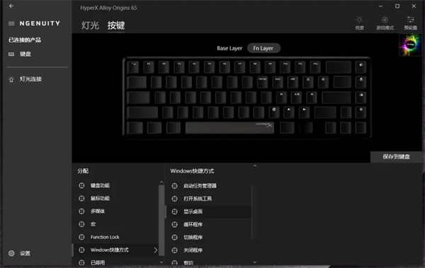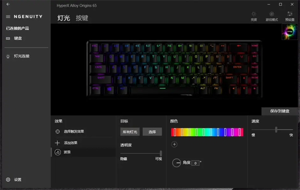 和之前起源系列键盘一样,HyperX起源65也是支持HyperX NGENUITY驱动的,玩家可以从HyperX官网或者微软商店下载;而在实际使用中,玩家可以通过驱动界面调整设备的灯光效果和自定义按键。