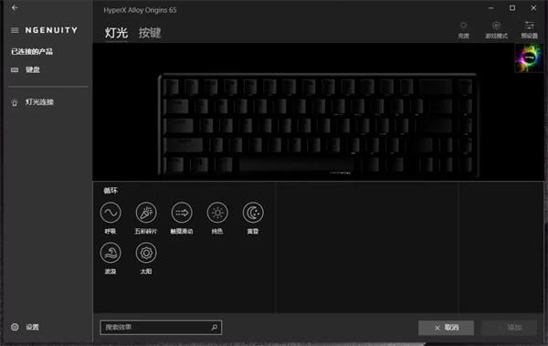 HyperX起源65默认支持7种灯效,分别为呼吸、五彩碎片、滑动、单色、黄昏、波浪以及太阳,而键盘默认灯效为波浪,灯效类似于大家常见的RGB循环灯效;通过驱动界面,除了选择灯效外,还可以自定颜色、灯效速度变化以及灯光亮度,可以说该有的都有了。