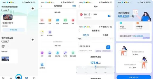 通过“乐歌小秘书”APP,我们还可以进行更多的操作。比如健康管理、待办、闹钟等功能。通过输入身高体重,便可以计算出适合的坐姿和站姿高度,然后定制站立计划,智慧屏便会定时提醒你定时站起来运动。