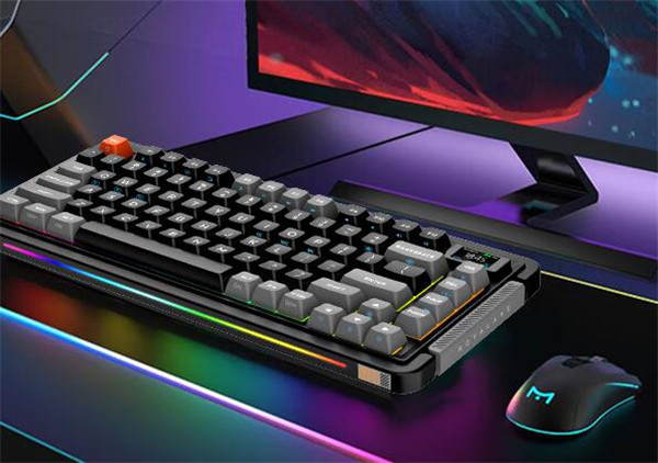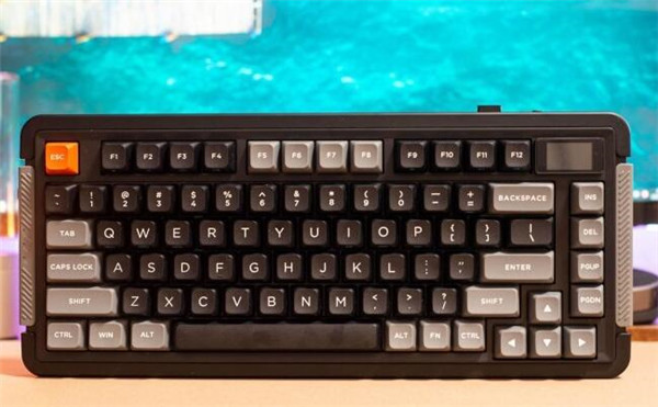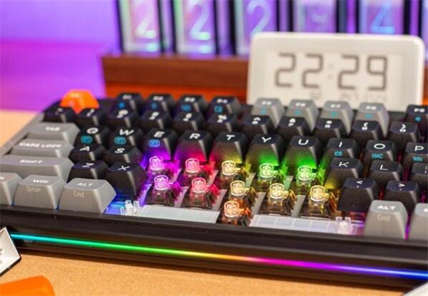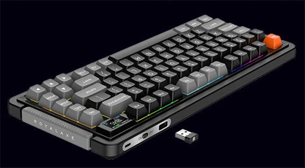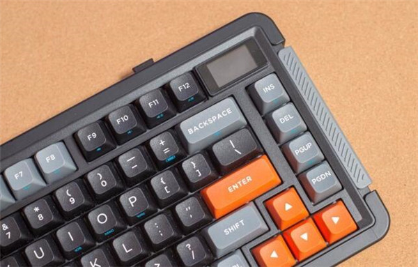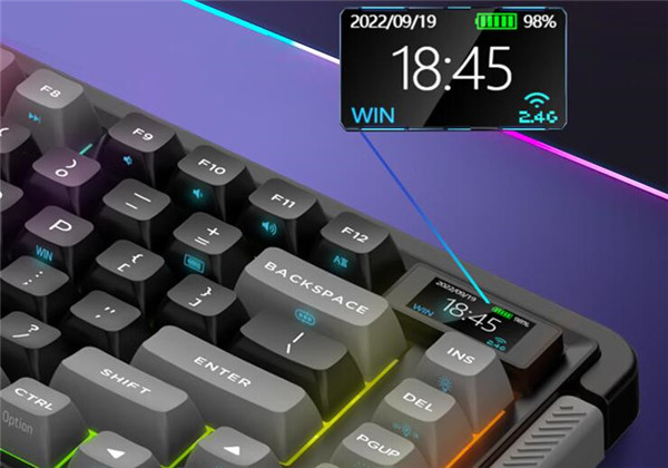 右上液晶屏算是这款键盘最大的亮点了。不仅可以显示电量,还可以显示连接方式,设备使用的系统以及时间日期。对比同样使用这种设计的键盘,御斧 L75 算是显示最全面的,没有浪费这么大块屏幕。