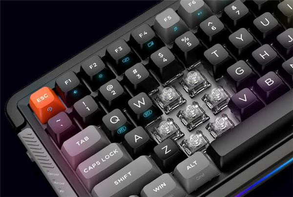 5脚轴座兼容性强,上灯位设计也对应轴体的聚光镜效果。御斧L75 使用的主流的 Gasket 结构,卫星轴大键位,下方还专门铺了层硅胶,按压一致性不错,对杂音抑制也是立竿见影,手感扎实,回弹硬中带软。