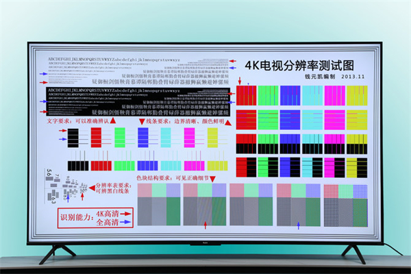Redmi智能电视X 2022款4K显示测试。该套图是基于电视画质显示原理,为4K电视进行全方位多角度的定制。测试图分别从清晰度、色彩准确性对电视画面进行测试。测试图片有红蓝两个箭头,蓝色为1080P,红色为4K。