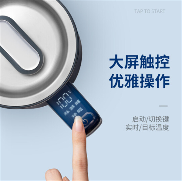 整个机身除了底部印有摩飞的logo以外,整机浑然一体,但把手部分可就大有玄机了,摩飞恒温电热水壶MR6070采用触屏操控,手柄处设有高清显示大屏,功能菜单、目标水温、实时温度一目了然,轻触即可启动/切换功能,省去复杂按键,一键操作更显便捷和人性化,家中老人也能轻松上手。
