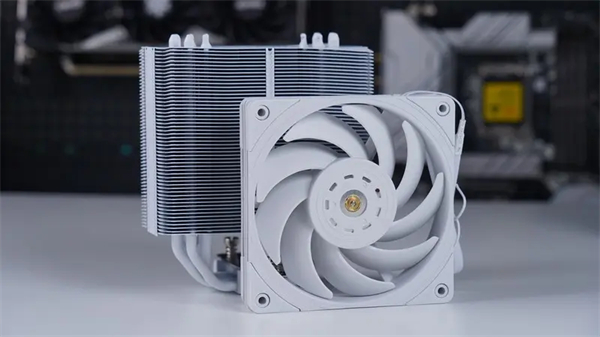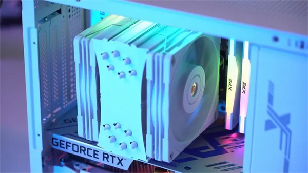 散热本体采用通体白色喷涂,配备了6根6mm纯铜热管,回流焊工艺。以高密度集成鳍片来进行压缩体积以及最大限度的压榨导热性能。