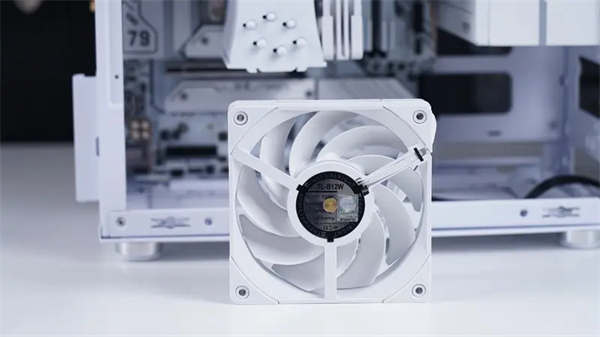 标配两把利民的白色TL-B12W风扇,风压性扇叶经过三次动平衡矫正,震动更小,同时配备橡胶脚垫,最大转速2150rpm,最大风量69CFM,风噪28.1dBA。