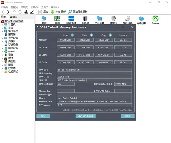 AIDA64内存测试方面,DDR5-6000MHz的内存跑出了93691MB/s和82408MB/s的读写,延迟69.1ns,性能有所提升