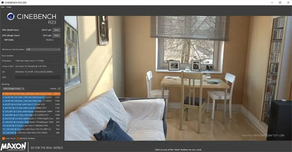 CINEBENCH R23测试,单核成绩2075pts,多核成绩30147pts。