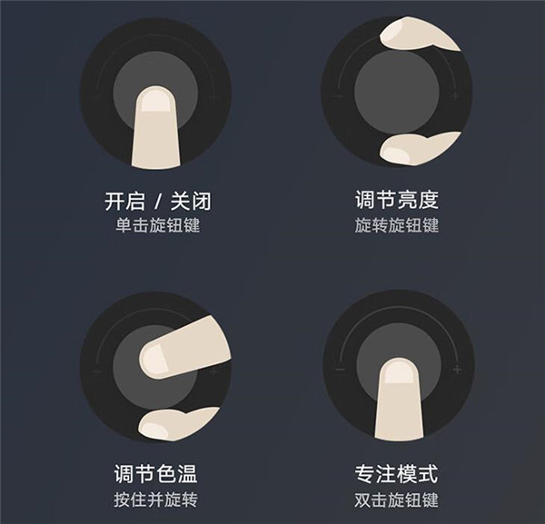 极简风的米家台灯1S 耀夜黑底座上只设置了一个多功能按钮,正常按压可以开启或关闭台灯。旋转按钮可以调节灯光亮度,按住并旋转按键可以调节灯光的色温。
