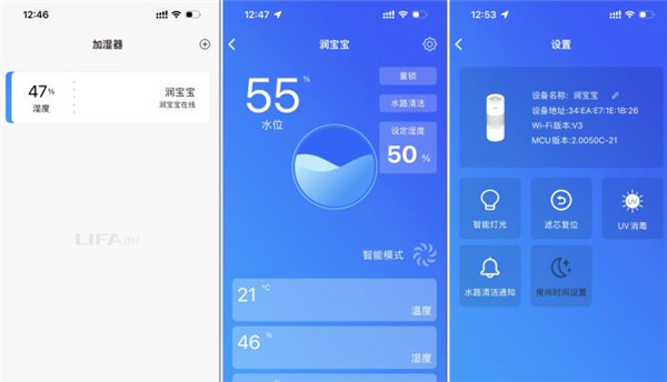 净化空气方面LIFAair加湿器在加湿空气的同时起到净化空气的作用,从水源、空气、加湿滤网,水路,烘干,五大除菌技术,给宝宝打造一个舒适、健康的居住环境。