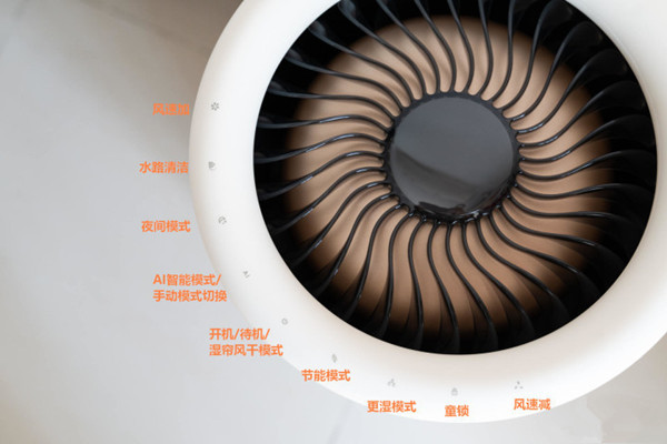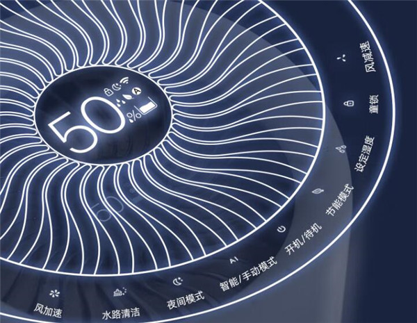 采用触摸式控制环,无实体按键,自左向右分别是:风速加、水路清洁、夜间模式、AI智能/手动模式、开机/待机/湿帘风干模式、节能模式、更湿模式、童锁、风速减功能。同时也有长按两个功能按键组合,实现查看滤芯寿命、滤芯复位、查看设备信息、进入WI-FI配网。