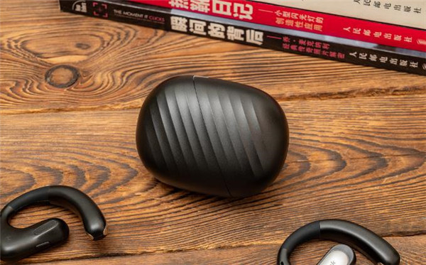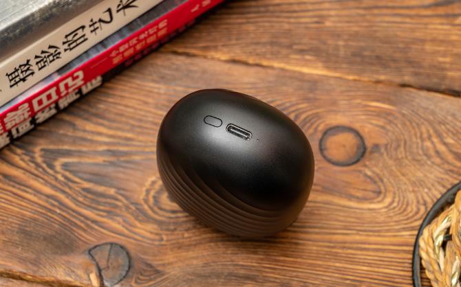 充电盒的鹅卵石造型,纯黑配色外加磨砂工艺,整体质感非常丰富,手感也不错,表面设计了一些U形凹槽斜纹,可以起到防滑的作用,在一定程度上还增加了充电盒的单体感,让黑色显得不那么单调。
