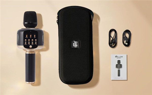 除了D10麦克风,包装盒内还有说明书、充电线和音频线。