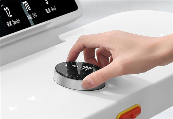 操作台十分宽大,中间布置了一个MERIT EYE飞梭旋钮控制开关,在旋钮顶部还有一个显示屏,可以查看配速、坡度、运动时长、体能消耗等参数。旋钮两侧分别布置了同样的触控按键,左边为坡度调节区,右侧为速度调节区,使用飞梭旋钮还是触摸操控可以根据自己的偏好来选择。