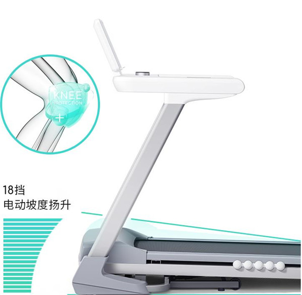 18档坡度调节这里建议根据自己的运动偏好来进行科学调整,值得一提的是在课程锻炼中,我们是无需进行手动坡度设定的,坡度会随着课程进度自动调整,超级方便。科学研究表明2°为一个十分合理的坡度,在这个坡度下我们不但可以消耗掉更多的卡路里,还能对膝关节起到一定的保护作用,所以说选择一个带有坡度调节的跑步机还是非常必要的。