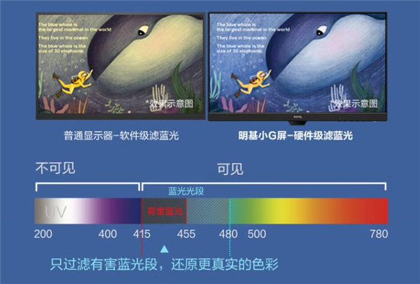 明基GW2485TC采用了经过德国莱茵TUV认证的智慧过滤蓝光(也是明基唯一一台硬件滤蓝光)可以做到只减少有害蓝光,保护视力。
