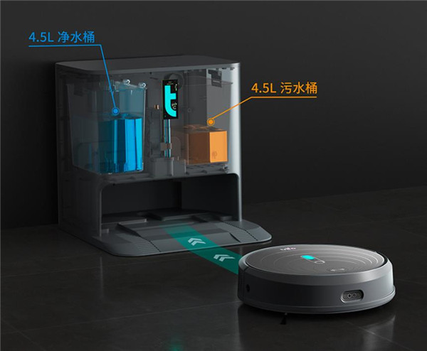 趣飞Viva机器人洗地机和当前非常流行的自清洁扫拖机器人长得基本一致,也是由一个基站和一台机器人两部分组成。基站内设计了一个清水桶和一个污水桶,个水箱的容量均为4.5L,清水桶自动给机器人内部净水箱补水,然后再通过吸污管道将机器人工作过程中产生的污水回收至污水桶中,全自动补充清水和回收污水的设计,可以更好的解放我们的双手。