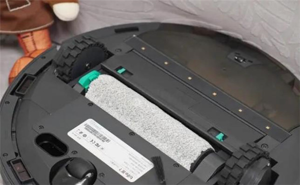 机器人底部的设计和常见的扫地机器人有着很明显的区别,那就是多出了一个位于底部中间区域的这个洗地滚筒。