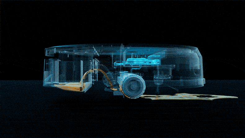 普通的扫地机器人在这个位置设计的是胶毛滚刷,只能用于吸扫干垃圾,而趣飞Viva机器人洗地机的这个滚筒则是和手持式洗地机一样,采用的是软绒毛滚刷,并且在滚筒一侧设计了用于刮水的软胶条,在清水的配合下通过高速转动,刮掉滚筒上的污水并通过大吸力吸回至污水箱中。