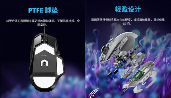 罗技G502 X恰恰在这两个方面都有优化,这也正是它吸引到我的原因——优化了脚垫表面积,带来了平衡无摩擦的滑动体验;采用了薄壁外骨骼,以少量材料实现了出色的刚度,并对滚轮进行了改进,让其整体重量从上代的120g+大幅缩减到了89g。