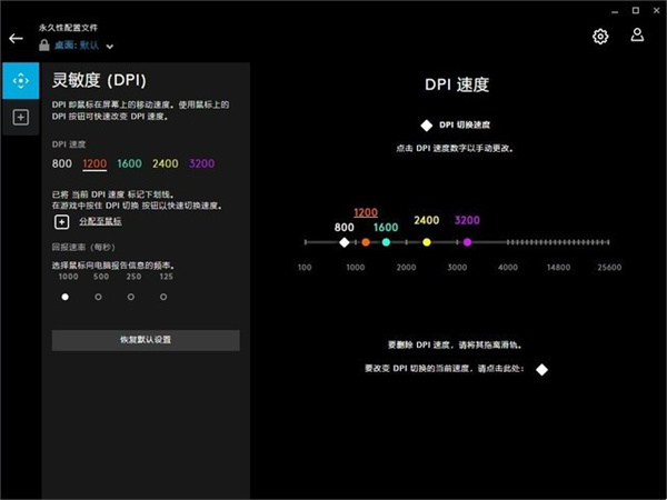 首先是DPI的调节,可以看到罗技G502 X支持的DPI范围是100-25600。在该页面也可以进行回报率的调节,罗技给到了四挡选择。