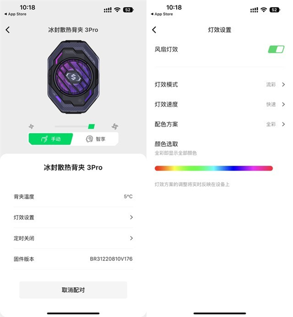 黑鲨冰封散热背夹3 Pro 凤求凰版和其他黑鲨配件一样,也通过黑鲨装备箱APP进行个性化配置。在APP中,用户打开风扇灯效开关后,即可选择不同灯效模式,还可以对配色方案、灯效速度以及颜色进行更加细致的调节。对于黑鲨手机用户,更有专属的“高光时刻灯效”,打开该模式后,在对局开始和游戏中击杀时,会为用户带来独特的灯效变化。
