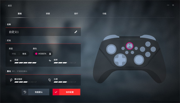 设置中,可以设置灯光颜色,震动强度,按键,以及摇杆的灵敏度等等。