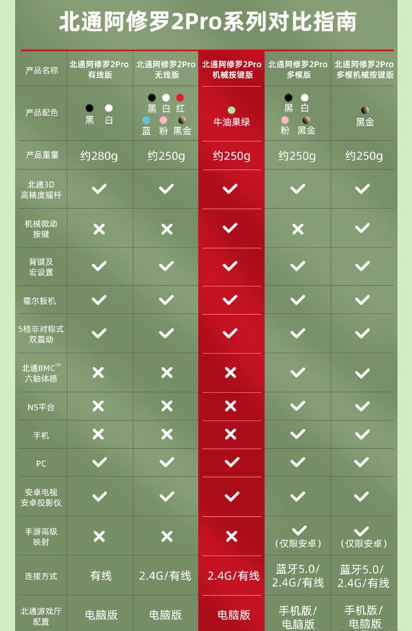 北通阿修罗2 Pro游戏手柄一共推出了多个 版本,除了无线机械版(支持PC/TV),还有多模机械版(支持NS/PC/TV)、多模版(支持NS/PC/TV)、无线版&有线版(支持PC/TV),大家可以根据自己实际需求去选择。
