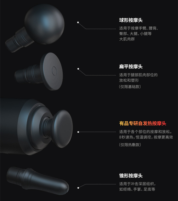 球型按摩头适用于按摩手臂、腰背、臀部、大腿、小腿等大肌肉群;而锥形按摩头适用于冲击深层组织,比如经络、手掌和足底等部位。有品针对不同的部位以及肌肉群配置了不同的按摩头,能够更好的为使用者提供按摩舒适度。
