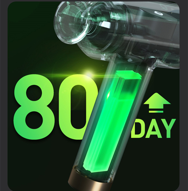 有品PICOOC H1筋膜枪的续航能力可以达到80天,之所以有这么长的续航能力,是因为有品研制了Power Tap低功耗供电方案,在拥有2000mA大容量电池的情况下,有品还为H1设置了无接触自动降速功能,防止误触碰。