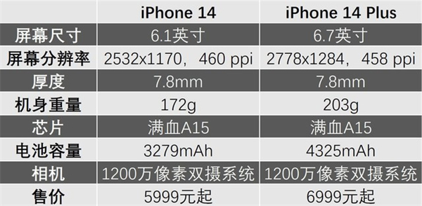 先上一张iPhone 14与iPhone 14 Plus的核心参数对比图: