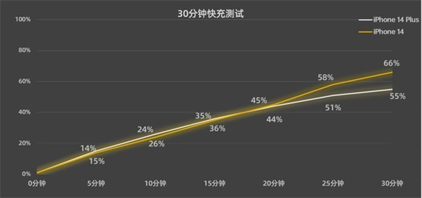 聊完续航,咱们再来说说充电表现。根据苹果官网描述,这两款设备在搭配20W或更大功率的电源适配器时,约30分钟可充至50%的电量。不过根据我们的测试来看,iPhone 14 Plus在使用20W功率的电源适配器充电时,30分钟只能充入44%的电量,而当我们换了一个30W功率的电源适配器后,30分钟可以充入55%,达到官方描述的预期。