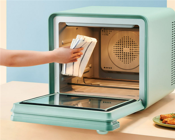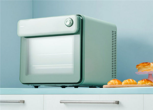 TOKIT厨几轻彩拍照烤箱外观设计比较有创意,和其他传统电烤箱对比,少了一些呆板的设计,增加了很多圆角设计,而且加上牛油果绿配色简约小清新的风格一目了然,这种设计,只要居家不是太复古设计,基本都比较好搭配。