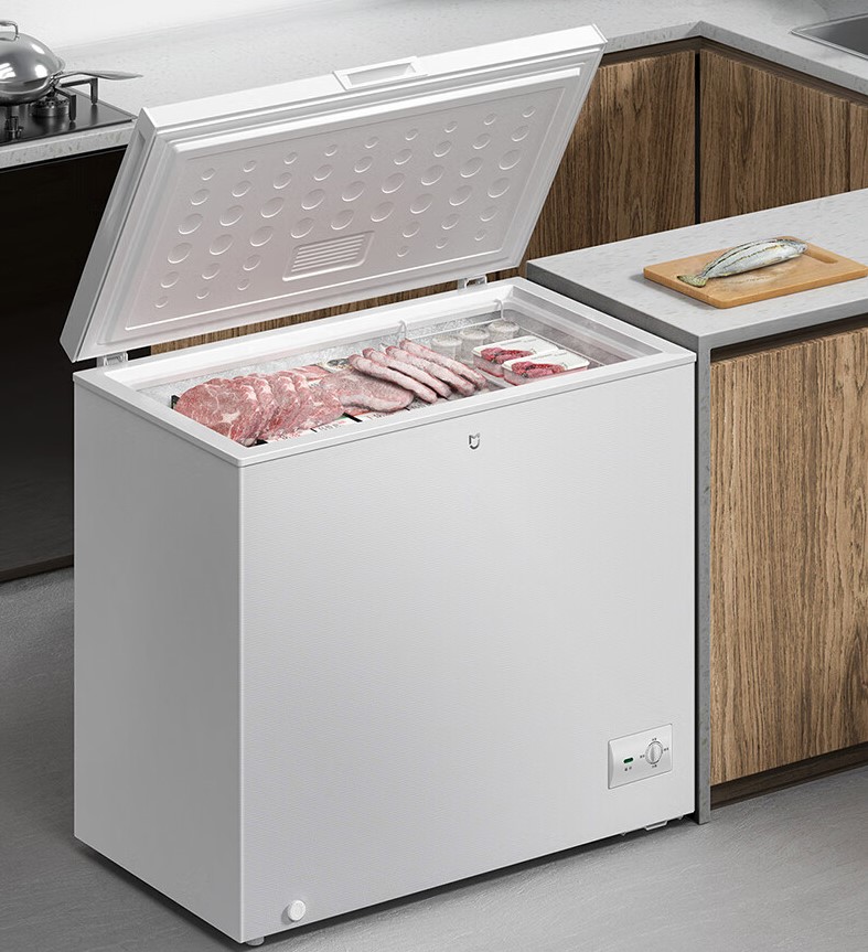 米家冰柜203L采用的是台阶式设计,得益于台阶式曲底设计,使其能够释放更多内部存放空间,让它具有203升大容量的储鲜空间,可装下170斤鲜排骨;另外,其内置了独立食品框,可用于单独存放小件食材,翻找更方便。